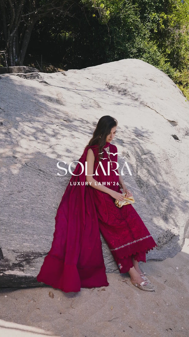 Scarlet is a sophisticated red lawn suit featuring an elegant A-line cut with exquisite embroidery, vibrant lace detailing at the hem, and coordinating dyed cotton trousers. The ensemble includes a beautifully embroidered Monar Dupatta with luxurious raw silk pallu, creating a refined look for special occasions.